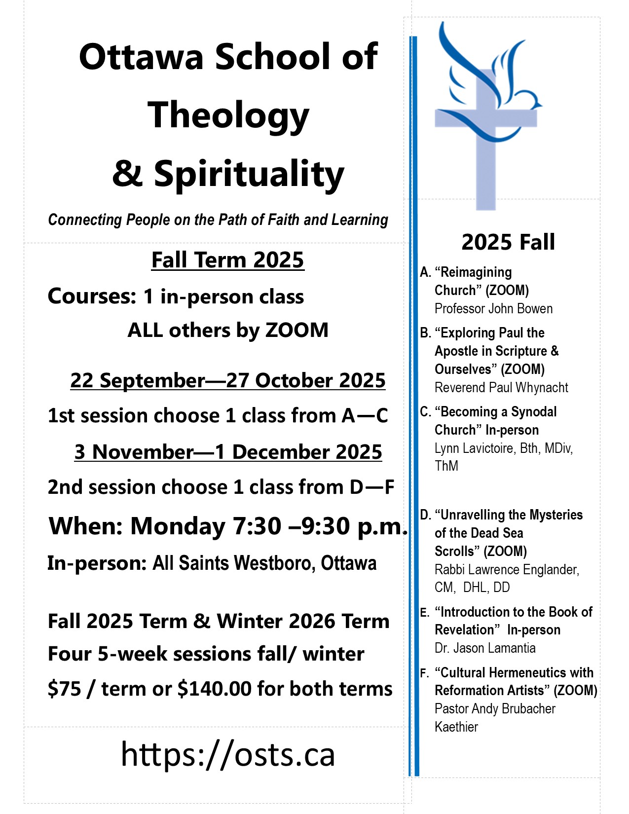Adult Learning–All are welcome. Affordable-$75 / per term or $140.00 for both fall and winter terms. Fall 2025 term two 5-week sessions. Most classes are on ZOOM. In-person: All Saints Anglican/First United Westboro. A variety of courses to select from. No homework, no tests. The EOORC is in support of OSTS.