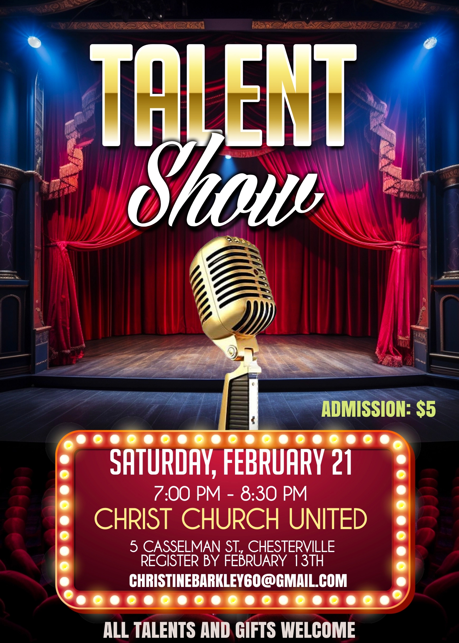 Talent Show for all ages. No registration fee required. All talents / gifts are welcome. Please […]