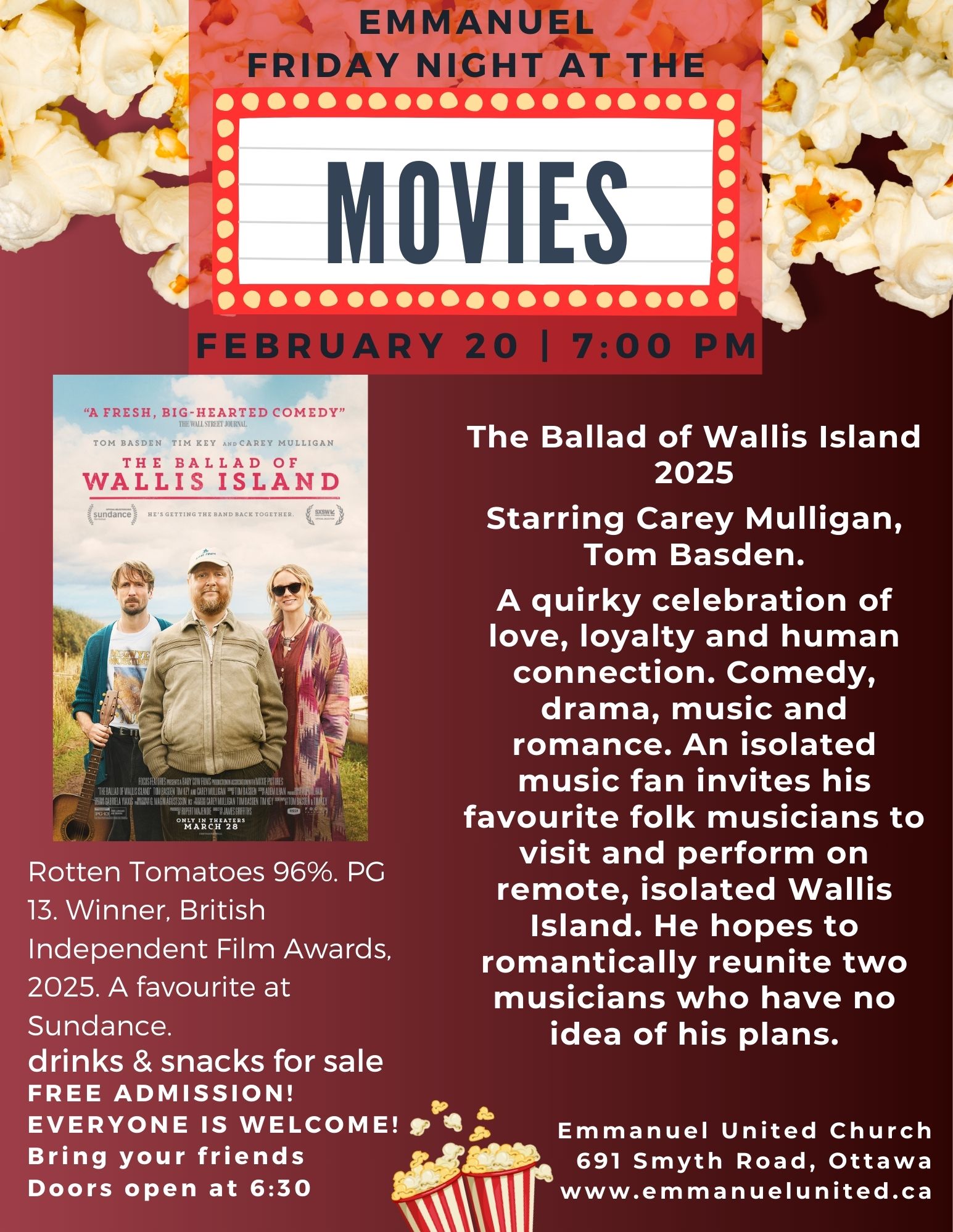 Emmanuel movie night, Friday February 20, 2026 brings you The Ballad of Wallis Island, UK 2025. […]