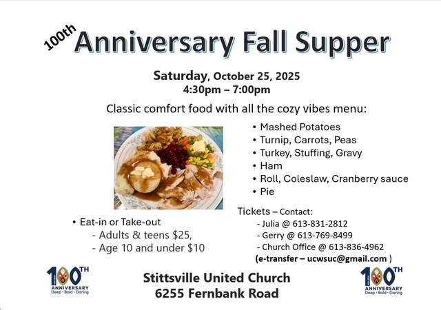 Stittsville United Church will be hosting its 100th Anniversary Fall Supper on Saturday October 25, 2025 […]