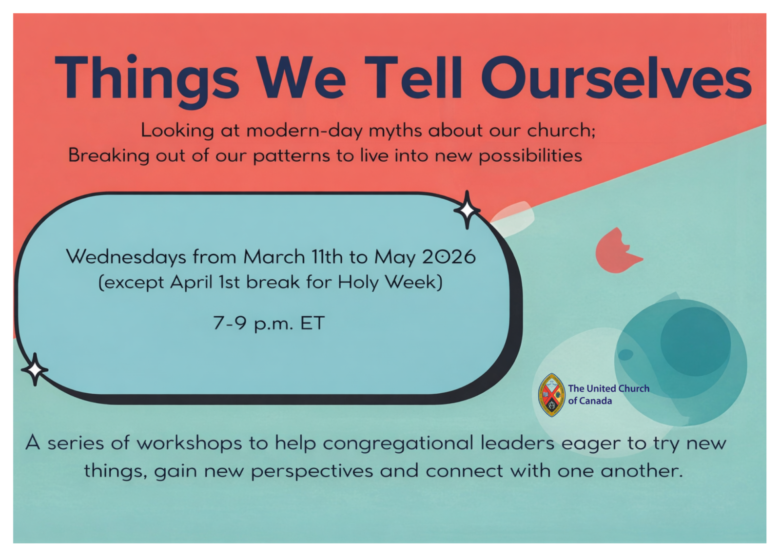The United Church has spent 100 years establishing patterns and ways of doing ministry. Many of us are still doing what the church was doing a generation or two earlier. We want to try new things but don’t know where to start. We’ve created a narrative that doesn’t always match reality. It’s time to talk about it and unpack the things we’ve been telling ourselves.
