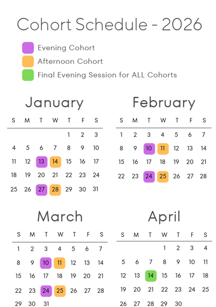 Wednesday Afternoons from 2pm to 3:30pm ET (Jan. 14, 28, Feb. 11, 25, Mar. 11, 25, and Tuesday evening April 14 at 7pm ET)